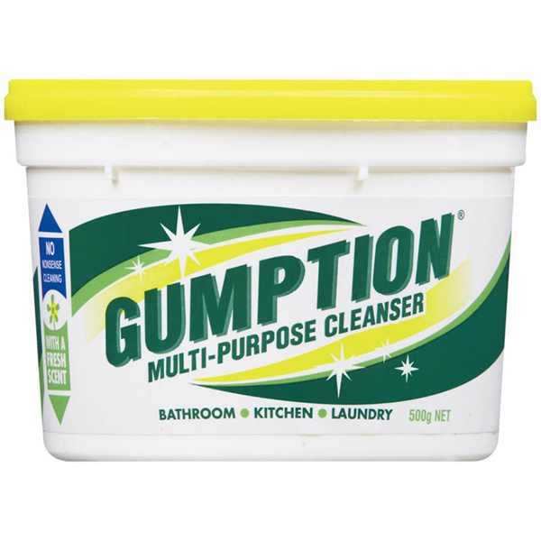Tried and trusted, Gumption Multi-purpose Cleanser has been a cleaning-cupboard staple for generations For over 60 years, Gumption has been tackling those tough cleaning jobs around home, bringing back an unbeatable shine and an outstanding clean every time! It uses a special soap formulation with unique exfoliating beads to break down and gently lift even the toughest of stains, grease and grime, out of the surface Gumption can be used on most modern surfaces such as natural stone bench tops, laminates, baths, basins, tiles, stove tops, ovens and even stainless steel sinks. It will even restore the shine to your pots and pans! Best of all, Gumption contains no bleaches or harsh chemicals, meaning it's safe as well as versatile Multi-Purpose Cleanser No harsh chemicals or bleach Non-toxic and no fumes Lemon-scented Made in Australia