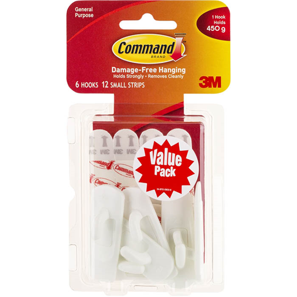 Damage-free hanging Holds strongly and removes cleanly Easy to apply and remove Works on a variety of surfaces Ideal for organising and decorating any home or office environment Contains 6 small hooks, 12 small strips