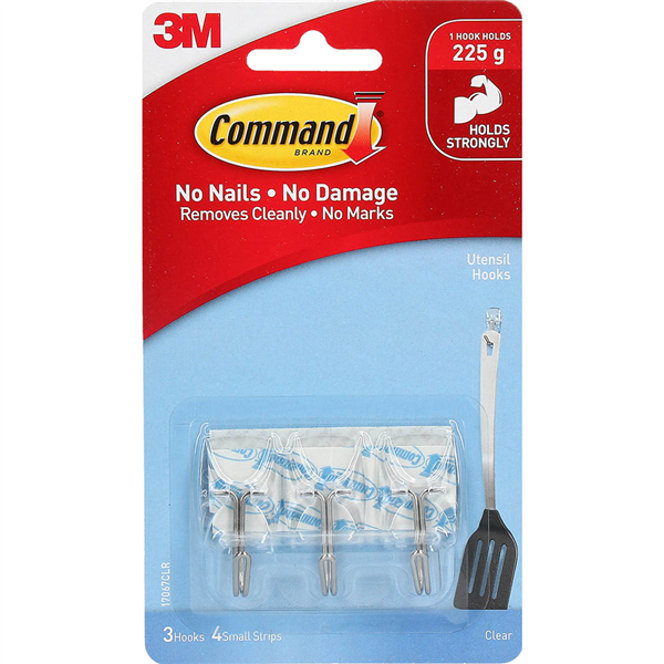 Damage-free hanging No nail holes Holds strongly Easy to apply and remove cleanly Picture locks in place Works on a variety of surfaces Great for hanging Utensils in the Kitchen or other items anwhere else in the home as the clear design blends in with any wall surface Command Clear Utensil Hooks holds up to 225g and the package includes 3 hooks, 4 small strips