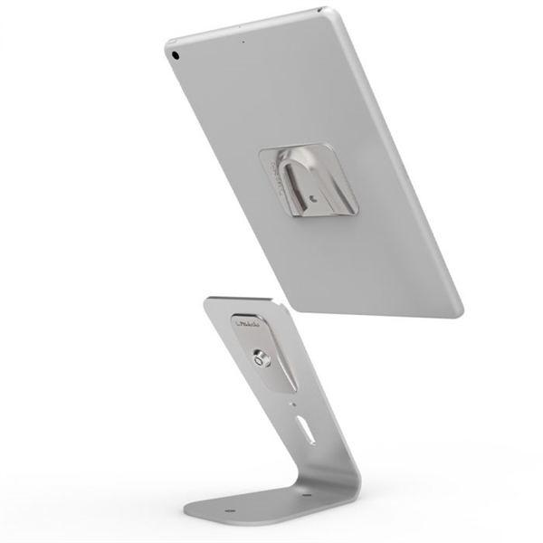 Universal Display Lockable stand for any Tablet or Smartphone The clean looking design Hover Tablet stand is a one of a kind product that can provide you with a simple clean way to securely display your tablet The HoverTab is a two part system, the first being an adhesive steel plate that connects to the back of the iPad, Galaxy Tab or smartphone The second is the six inch high stand, sloped at a 60 degree angle for an optimal viewing angle and has 4 inch base for stabilized balance no matter the connected device Universal Tablet Security Stand Set In Portrait or Landscape Mode Industrial strength 3M VHB adhesive Counter-top or Wall Mountable Weight Balanced Stand Base Keyed Quick Lock / Unlock Compatible with our Cable Locks
