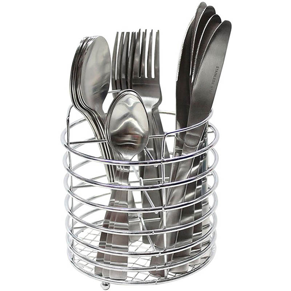 Ideal for office, boardroom and general use The 24 piece cutlery set with chrome caddy is a compact and tidy way of storing cutlery Consists of 6 knives, 6 dessert spoons, 6 table forks and 6 teaspoons Stored in a wire caddy