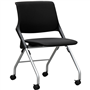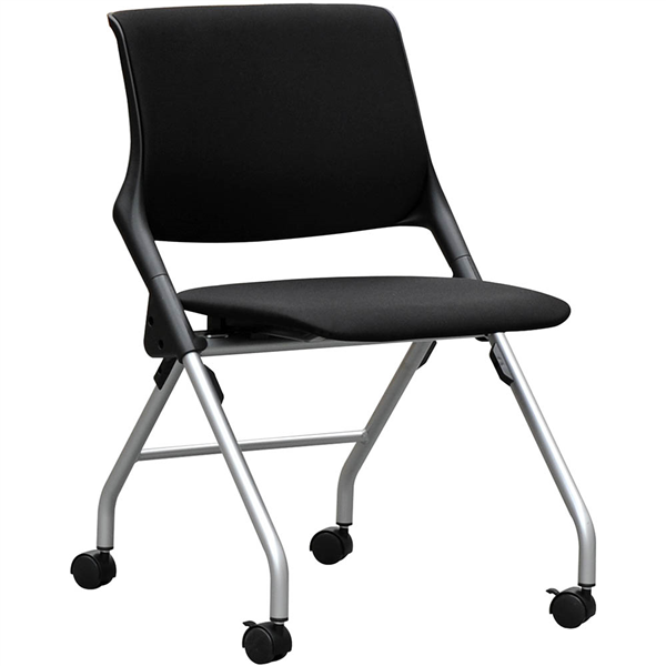 Practical and ideal design combining fashion and modern, foldable seat, maximize office space and simplify storage, polypropylene with fabric padding Stackable, with 2 Lockable and 2 unlockable castors Black fabric upholstery with silver frame