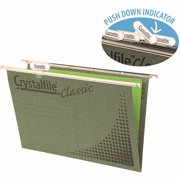 Made from manilla board and smooth nylon runners, they are the ideal choice for your suspension filing needs Made from quality manilla board Made from 100% recycled board and is 100% recyclable Nylon runners ensure smooth, quiet gliding of suspension files Pre-Punched and ready to use with Crystalfile file fasteners Suitable for filing cabinets, desk drawer chassis and desk top organisers Ideal for long term use Includes tabs and inserts