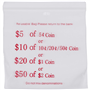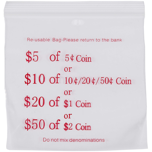 Cumberland clear plastic Press Seal coin bags with denominations and values for 5c, 10c, 20c, 50c, $1, $2 coins printed red