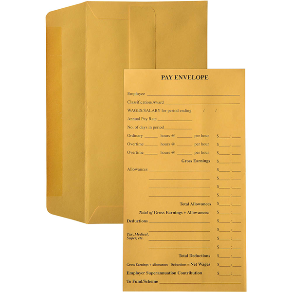 Cumberland printed pay envelopes are designed to comply with the recording requirements of Fair Work Australia, Federal & State Award and Industrial Relations Regulations These printed gold Kraft envelopes have a side loading that allows for all note denominations to be inserted flat into the envelope Complies with Fair Work Australia recording requirements and Federal and State Award Printed on gold Kraft stock with a self seal flap Strong kraft envelopes hold pay slips, notes and coins safely and securely Recyclable Side Loading