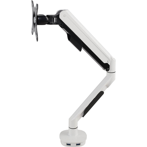 Elegant white And black styling in a finish which will transform any office into a modern work hub A higher adjustment range and an improved desk clamp make this the value choice among monitor mounting options Increases your desktop real estate by lifting your monitor off the desk and lets you charge your USB devices right where your clunky monitor base used to sit Simple and stylish modelling, compact and rugged Made of aircraft aluminium 360 degree free switch between portrait and landscape orientation Double USB ports Support monitor up to 30 inch Sleek and streamlined appearance perfectly complements any contemporary workstation Balanced gaslift height adjustable arm Full rotation, 360 degrees at any position Up to 30 inch monitor 85 degrees upward, 15 degrees downward Cable management Clamp and grommet mount included 10 year warranty
