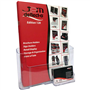 All-in-one display featuring a business card holder attached to the brochure holder Constructed of clear durable polystyrene plastic Attractive and functional design Free stand or wall mount