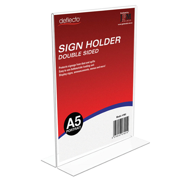 DEFLECTO SIGN HOLDER T-SHAPE DOUBLE SIDED PORTRAIT A5 CLEAR