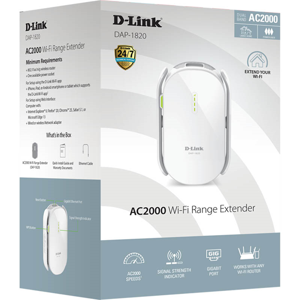 High-speed Wi-Fi connectivity for all your devices Dual-band with combined speeds of over 2000 Mbps throughout your home D-Link Wi-Fi Mesh for 11ac support for creating your own mesh Wi-Fi network Industry-standard 128-bit wireless encryption LED signal strength indicator helps you find the best location for optimal performance Gigabit Ethernet port for access point mode or to connect a wired device to your network Sleek and discreet wall-plug design blends well into any home environment Set up is quick and easy using the free D-Link Wi-Fi app or D-Link One-Touch setup Powerful Wi-Fi Throughout Your Home- The DAP-1820 is a portable plug-in wireless extender that lets you extend an existing wireless network and rid your home of pesky Wi-Fi dead zones once and for all Future-Ready Your Mesh with Wi-Fi Mesh- The DAP-1820 is Wi-Fi mesh enabled and combines with any D-Link Wi-Fi Mesh for 11ac enabled router to bring you seamless Wi-Fi mesh - our signature mesh turbocharges your whole home network with a ton of advanced features that add massive functionality to your mesh network