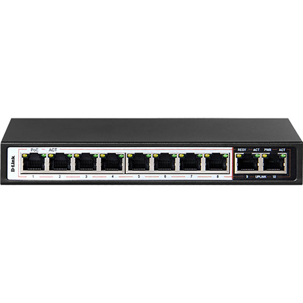 Has 10 ports in which 8 are long reach 250m ports and 2 are uplink ports Up to 250m PoE and Data Transmission- Equipped with PoE extend technology, the DES-F1010P-E have the capability to supply 802.3af/at PoE and data connectivity on cables up to 250m long 6KV Surge Protection- D-Link DES-F1010P-E switch is enhanced with 6KV surge protection. This effectively protects the switch against sudden electrical surges caused by events such as lightning strikes or unstable electrical current. Built-in 6 kV surge protection significantly reduces the chances of equipment being damaged from electrical surges, and effectively lowers maintenance costs by minimizing the need for expensive equipment repairs or replacement Enhanced with VLAN Function- With a flick of button you can isolate switch ports from each other, but still allowing the devices to communicate via the uplink ports. This feature not only adds security but can also effectively suppress network storms and improve network performance Enhanced with QoS- The DES-1010P-E switch performance is enhanced with QoS (Quality of Service) feature to ensure that critical network services such as IP surveillance, VoIP, IPTV are always given high priority. This feature makes the switch a perfect solution for IP Camera/CCTV applications Intelligent Detection- With AI PoE feature enabled the switch can automatically detect an unresponsive PoE device and reboot the devices in order to recover it 8 x 10/100 Mbps Fast Ethernet PoE+ Ports 2 x 10/100 Mbps Uplink Ports PoE+ support - up to 30W per port Long Reach PoE support - up to 250m Small additional features like Extend, VLAN, QoS and PoE Reset Lightning protection built-in (6kV) PoE Budget 96 Watts Plug & Play Installation