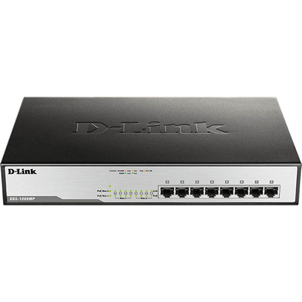 The D-Link DGS-1008MP 8-Port PoE Desktop Switch is an ideal solution for small offices and enterprise environments looking to expand the network with a set of Power over Ethernet devices such as wireless access points, IP cameras, and IP phones. Built with small business and enterprise users in mind, the DGS-1008MP is a high-speed, flexible switch that features a fanless, quiet design so it can be conveniently placed anywhere in a working environment