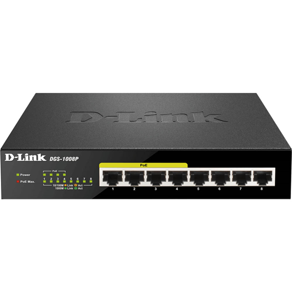 Supports both IEEE 802.3af and IEEE 802.3at Power over Ethernet (PoE) standards A large 68 W PoE power budget and up to 30 W of power per port Plug and play installation Flexible Connectivity- The D-Link DGS-1008P enables both home and office users to connect Power over Ethernet (PoE) devices such as wireless access points, IP cameras, and IP phones to your network in remote locations without the need for external adapters. Built with home and small business users in mind, the DGS-1008P is compact and operates silently, making it ideal for virtually any room or office Compact and Silent- The DGS-1008P has a compact design, meaning it can be placed virtually anywhere, including small offices and work spaces where space is at a premium. The desktop form-factor provides everything you need to set up a new network, or expand an existing network by connecting it to other switches. The fanless design ensures silent operation, making the switch suitable for office spaces, work floors, and noise-sensitive areas such as meeting rooms Power over Ethernet- The DGS-1008P features four 10/100/1000BASE-T ports that support the IEEE 802.3af and IEEE 802.3at PoE protocols, enabling these ports to supply up to 30 W of power to connected devices for a total PoE power budget of 68 W. This allows compatible devices to be connected without requiring an additional power supply, saving on cabling and allowing devices to be installed in locations without immediate access to power outlets High Performance- The DGS-1008P features Auto-MDI/MDI-X support on all ports which removes the need for crossover cables when connecting to another switch or hub. Auto-negotiation on each port intelligently adjusts the port speed for optimal compatibility with the connected device. With wire-speed filtering and store-and-forward switching, the DGS-1008P maximizes network performance while minimizing the transmission of bad network packets
