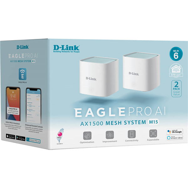 AX1500 Wi-Fi 6 - Ideal for 4K streaming, VR gaming, video calling, and keeping all your Smart Home devices connected AI Convenience - Easily turn on or off the intelligence that conveniently improves and optimises your network automatically Parental Controls - Provide a safe experience for your family with controls for website blocking, setting schedules and guest logins Efficient Connectivity - 4 simultaneous streams, 1024 QAM, BSS-colouring and MU-MIMO ensure you'll always have the best connection quality possible OFDMA - Small data packets destined for multiple devices are transmitted together and never have to queue up again. Perfect for bandwidth-hungry devices battling for bandwidth Wi-Fi Security - The latest WPA3 wireless encryption, and compliant with IEC 62443-4-1 to keep your network safe from unauthorised access Easy Setup & Management - D-Link's free EAGLE PRO AI app brings you a personal AI Assistant to help you manage your Wi-Fi, with added voice control through Amazon Alexa and Google Assistant Expandable Coverage - Add E15 Wi-Fi Extenders to build a Smart Mesh network Smarter Than Your Average Mesh Network - With built-in intelligent connectivity technology, the M15 ensures that the fastest speeds are always being automatically delivered to you, so you can load websites & watch videos in a snap. The built-in AI Wi-Fi Optimiser continuously connects you to the best Wi-Fi channel, while AI Traffic Optimiser prioritises your most critical Internet usage for optimal online experience and stability Reaches Further Than Ever Before - Wi-Fi 6 is perfect for Smart Homes where you need flawless connectivity on multiple devices at the same time. And Wi-Fi 6 also provides a strong network that enables the whole family to stream, game or work without worrying about buffering, dropouts or interference A Mesh Network You Can Rely On - Enjoy an AI-optimised Mesh network which automatically detects the optimal channels so you always experience your Internet at its best And unique AI beamforming enhances your Mesh connectivity between each node, for mesh Wi-Fi throughout your home that you can count on Unprecedented Speeds and Efficiency - Increase your network capacity by up to 4x with MU-MIMO, OFDMA, and BSS Colouring to handle more devices on the network with incredible efficiency. Now you can connect multiple devices simultaneously to your Smart Home without worrying about your network Plug In For a Wired Gigabit Connection - With the built-in Gigabit LAN port per node, you can use an Ethernet cable to enjoy a reliable wired connection and interference-free connectivity without dropouts Stay Connected As You Move From Room to Room - D-Link's Smart Roaming technology creates a single seamless network that ensures that your devices are automatically connected to the strongest possible signal, so you'll always have the best connection possible as you move, without having to worry about blackspots and dropout zones Easy to Add More Coverage From apartments to multi-storey houses, backyard patios and garden decks - additional EAGLE PRO AI M15 units provide more Mesh network coverage, giving you seamless high-speed Internet coverage that will eliminate Wi-Fi dead zones in those hard-to-reach areas throughout properties of any size Safeguards Your Privacy and Security For Peace of Mind - Comes with the latest WPA3 wireless security that&?s compliant with CNSA requirements and uses 192-bit encryption, ensuring that you and your privacy are safeguarded from unauthorised access