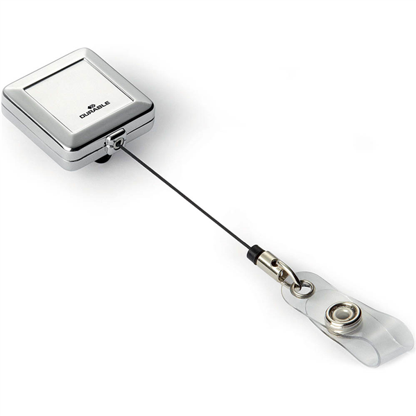 Chrome square badge reel with extra-strong metal clip fastening mechanism on reverse Provides quick and easy access to safety and access control passes May be combined with all DURABLE name badges or security passes that either have a punched hole for a clip or pin