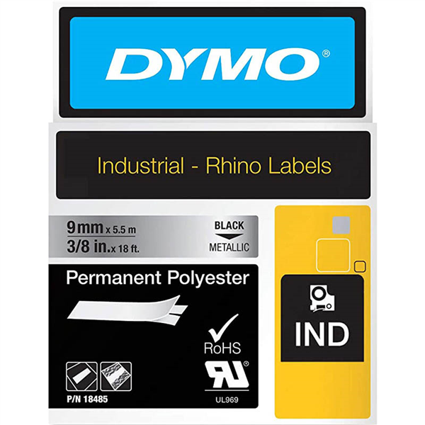 DYMO 18485 RHINO INDUSTRIAL TAPE PERMANENT POLYESTER 9MM BLACK ON METALLIC