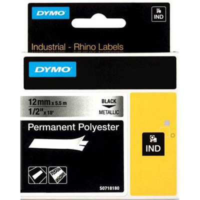 DYMO 18486 RHINO INDUSTRIAL TAPE PERMANENT POLYESTER 12MM BLACK ON METALLIC