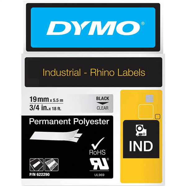 DYMO 622290 RHINO INDUSTRIAL TAPE PERMANENT POLYESTER 19MM BLACK ON CLEAR