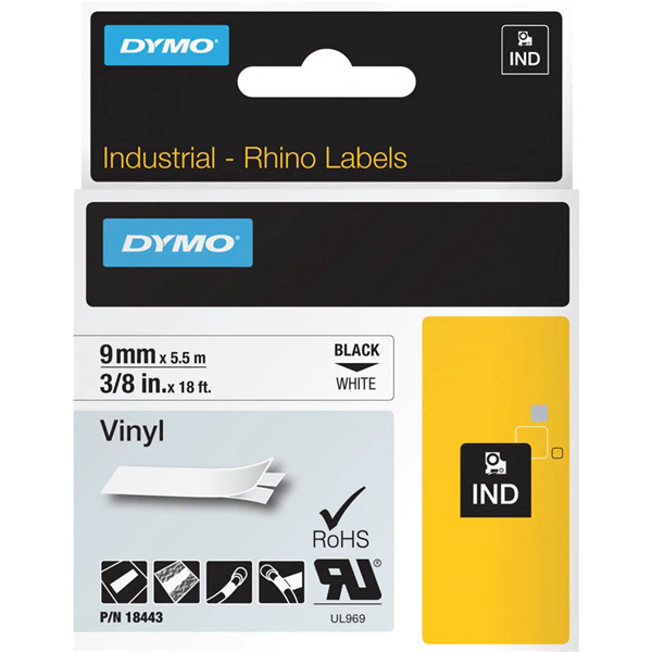 DYMO SD18443 RHINO INDUSTRIAL TAPE VINYL 9MM BLACK ON WHITE