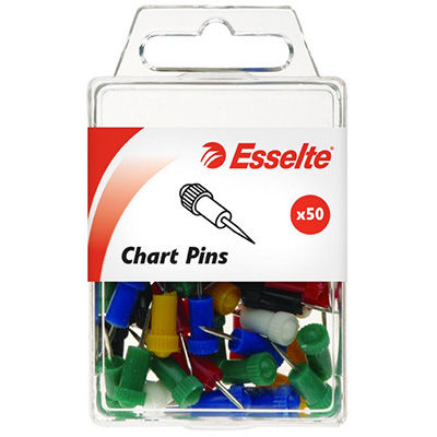 Ideal for pin-pointing or highlighting an area, tacking posters, menus or charts to walls, cork boards or porous surfaces Esselte chart pins have an 8mm diameter head and are 22mm long Choose the pin type to suit your needs Packed in a handy, reusable, plastic hangsell pack