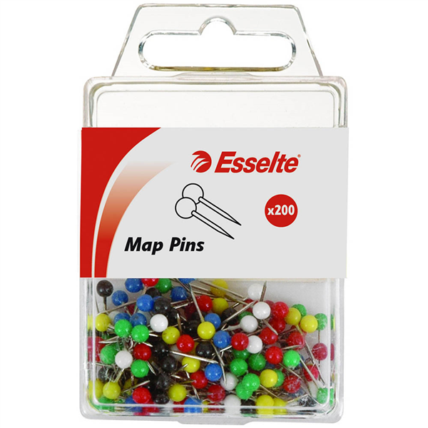 Ideal for pin-pointing or highlighting an area, tacking posters, menus or charts to walls, cork boards or porous surfaces Esselte map pins have a 4mm diameter head and are 17mm long Packed in a handy, reusable, plastic hangsell pack Choose the pin type to suit your needs