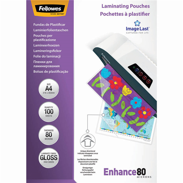 FELLOWES ENHANCE LAMINATING POUCH GLOSS 80 MICRON A4 CLEAR PACK 100