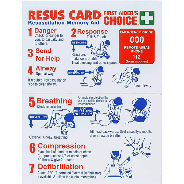 Card that fits in wallet or purse Easy to follow guide on DRSABCD (Danger, Response, Send, Airway, Breathing, Compression, Defibrillation)