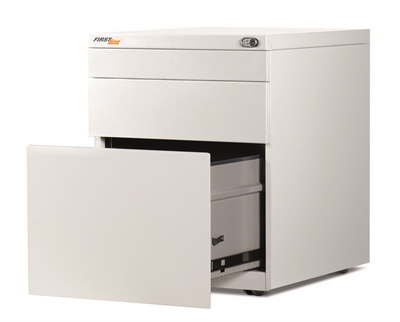 Anti-tilt fifth wheel fitted for safety. Fitted with nylon reinforced twin wheel castors. All steel construction. Durable oven baked powder-coat finish. Pencil tray included. Secure locking system provides peace-of-mind that items stored will be kept safe. Full drawer extension provides easy access to all files. 3 year warranty.