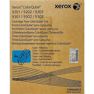 Xerox 108R833 Solid Ink Cyan metered solid ink sticks Each box contains 4 cyan wax sticks Approximately 37,000 page yield total SPECIFICATIONS Compatible for: Fuji Xerox ColorQube 9200, Fuji Xerox ColorQube 9201, Fuji Xerox ColorQube 9202, Fuji Xerox ColorQube 9203, Fuji Xerox ColorQube 9300, Fuji Xerox ColorQube 9301, Fuji Xerox ColorQube 9302, Fuji Xerox ColorQube 9303 Colour: Cyan Pack of 4 OEM: 108R00833