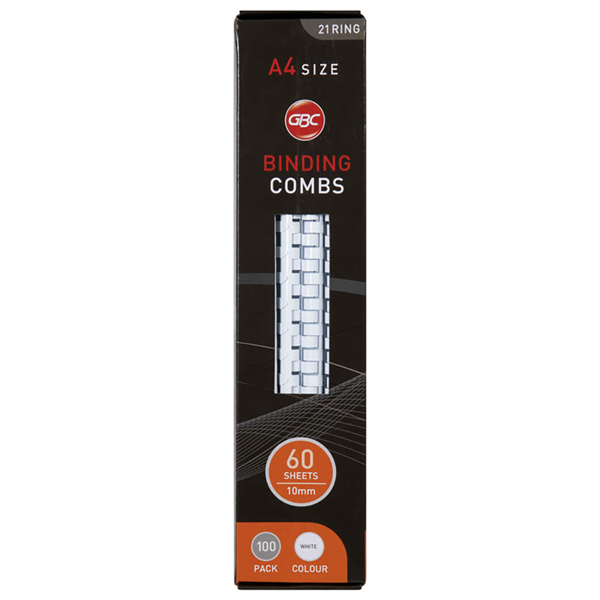 GBC PLASTIC BINDING COMB ROUND 21 LOOP 10MM A4 WHITE PACK 100