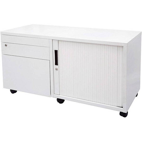 Ideal for users with a permanent workstation or Hot Desk users The unit is fully lockable and has a flush front mobile pedestal and a tambour door section with a centre shelf Fully Lockable Master Key locking series Flush Front Mobile Pedestal Tambour Door Section With Centre Shelf Ball bearing runners to drawers Available in Right or Left sided Tambour Door Backed by a 10 year warranty