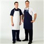 Cotton drill bib style apron centre pocket, pen pocket and name tag. Navy.