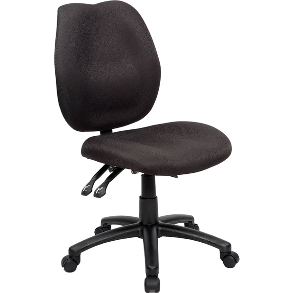 Adjustable seat height Lockable seat tilt Ratchet adjustable back Back tilt adjustment Fabric covered moulded seat and back for extra support and comfort 5 star nylon base 120kg indicative weight rating 5 year warranty