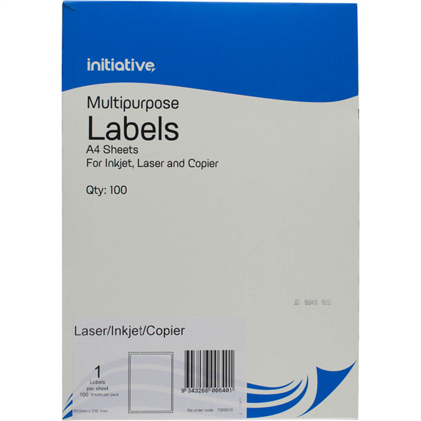 INITIATIVE MULTI-PURPOSE LABELS 1UP 199.6 X 289.1MM PACK 100