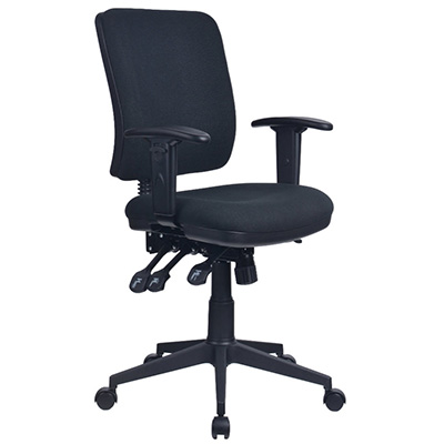 Ratchet back Seat slide Fabric covered moulded seat and back for extra support and comfort Seat and back tilt 5 star nylon base 120kg indicative weight rating 5 year warranty