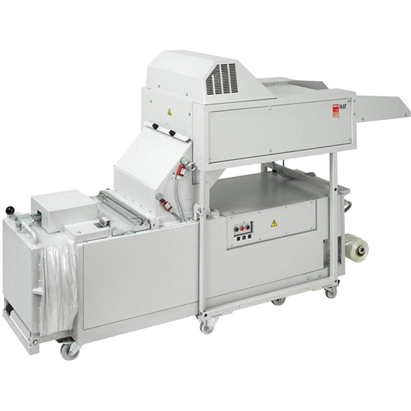 Large document shredder for smooth and crumpled paper 440mm working width; suitable for all standard computer formats Feeding via conveyor belt Bin full alarm, with simultaneous automatic stop of the shredding process 200 litre collecting bin supplied as standard equipment Small footprint to fit through standard door openings Mounted on rollers for flexible use All doors secured with safety switches Shredded material is automatically compressed into compact bales Shredder and baler operate in tandem Shredder loading can be continued while baler is compressing the material Push button control for bale ejection Alternative of bale ejection into plastic sack for clean, dust-free transport and weatherproof packaging Compressing stroke is triggered automatically Visual 'bale completed' signal and accompanying the cutting process is halted Two straps ensure stable bales