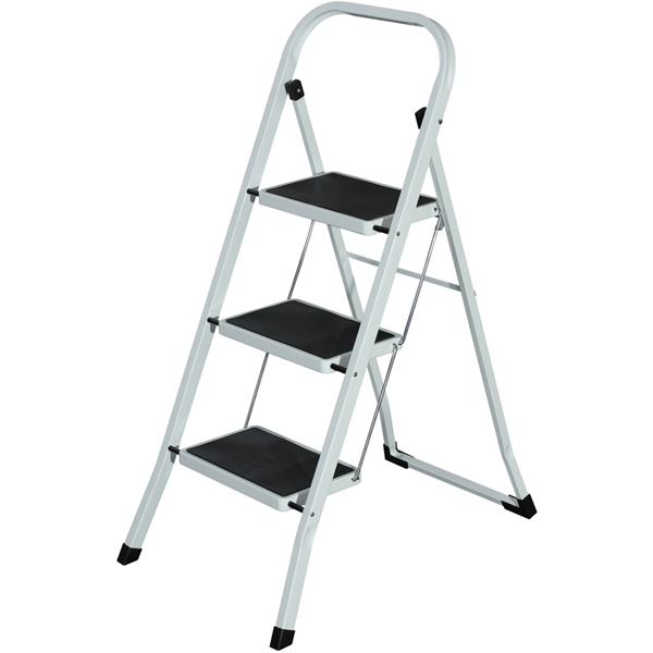 Made from powder coated metal offering durability and strength Wide metal steps for sure footed safety Non slip and non marking plastic caps on each leg tip Carries a maximum load of 130kg Height when open is 1040mm and folds to 30mm Strong and Sturdy Design Folds away for easy storage Rubber feet to prevent slipping 12 month warranty