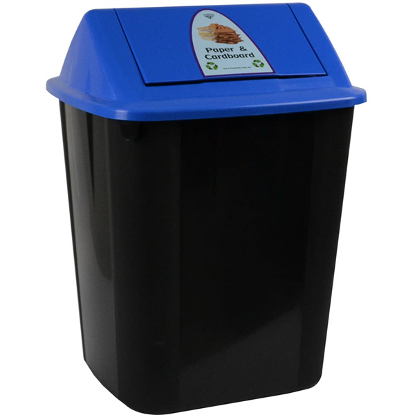 Paper and Cardboard Waste Separation System Bin is ideal for recycling of newspapers, office paper, magazines, paper bags, cardboard, brochures, etc. Australian Standard Colour Coding for waste separation of collected materials Base manufactured from 100% recycled polypropylene material Convenient 32 Litre capacity for easy collection of waste Bin offers incorporated bag clasp to prevent plastic bag liners from collapsing into bin and avoiding messy bag changes Bins can be conveniently placed next to each other to create a total waste separation system 100% Australian made