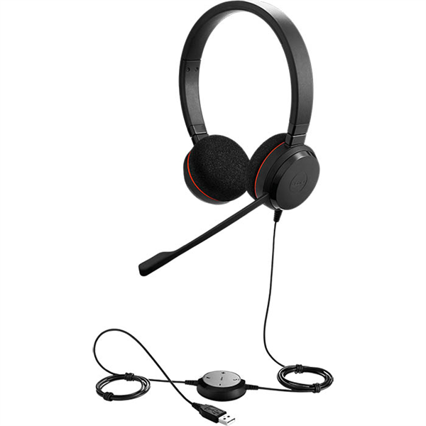 The Jabra Evolve 20 Stereo is a professional headset with easy call management and great sound for calls and music, Great sound for calls and music, Call control unit for managing calls, Plug-and-play connectivity