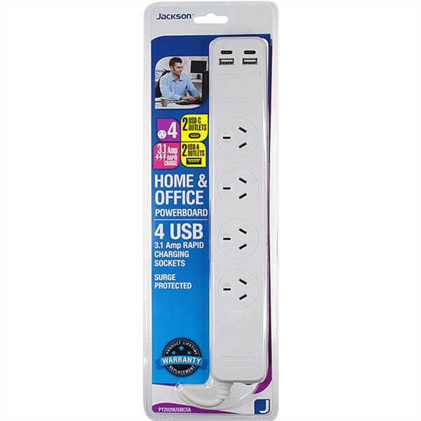 JACKSON POWERBOARD SURGE PROTECTED 4 OUTLET 2 USB OUTLETS 1M WHITE