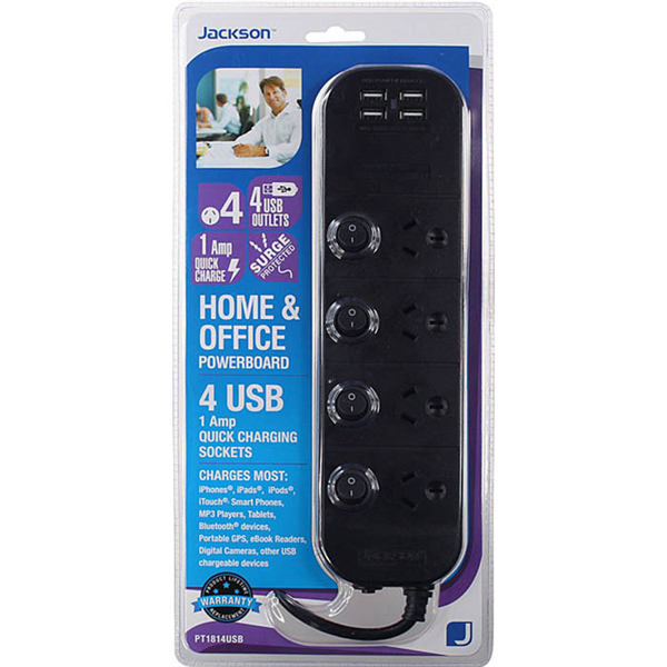 JACKSON POWERBOARD SURGE PROTECTED 4 OUTLET SWITCHED 4 USB OUTLETS 1M BLACK