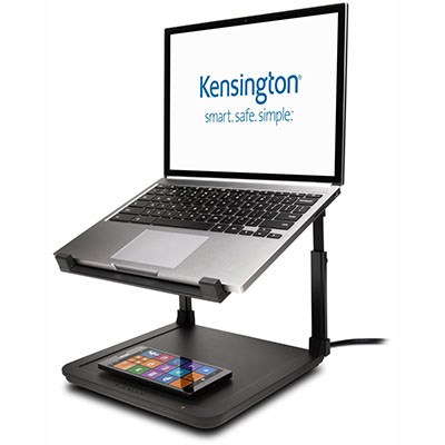 Lift your laptop up to eye level to relieve neck and back strain, then use the lower platform to wirelessly charge your phone Qi Wireless Charging Pad- Power your smartphone or other Qi-enabled wireless charging device with a dedicated wireless charging pad that is always on. Simply set your compatible device on the pad and watch the its battery fill up. Review your device's user manual to see if it is Qi-enabled SmartFit System- Allows you to select your personal height setting using the included colour-coded fitting chart so you can set the riser at your personalised height Height Adjustable- Raise or lower the platform to your custom height, placing the laptop screen at eye level which helps ease neck and back discomfort while working at your desktop Zero Footprint Enabled- Allows you to mount a compatible Kensington universal docking stations under the platform, which is ideal for desktops with limited space Cable Management- Unique design under the laptop platform allows you to route cords in a clutter-free way, producing a cleaner desktop experience Anti-Skid Tilt Design- Ideally angled so any laptop up to 15.6inch and 3.5kg is cradled in stability on the platform Kensington Security Slot- Add a ClickSafe or MicroSaver lock to either the right or left leg of the stand to lock it down and keep the riser safe from theft