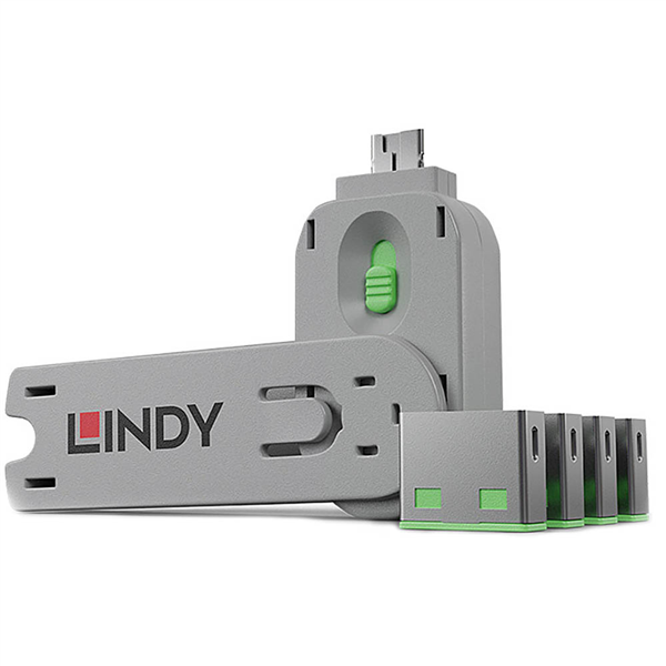 LINDY 40451 USB PORT BLOCKER WITH KEY PACK 4 GREEN