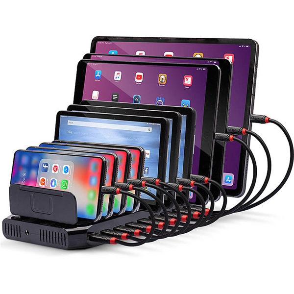 Each port can provide up to 5V 2.4A to satisfy the most hungry power devices If all 10 ports are occupied, the maximum current is 1.8A per port With its smart charging function, this USB Charging Station can recognise the connected device to automatically adjust the charging current for a fast and safe charge while also providing overcurrent protection to avoid excessive current damaging the device Plastic dividers can be assembled and stood on the top of the unit, which allows different widths for different tablets or mobile phone sizes This product is perfect for use in schools, libraries, hotels, restaurants or any location that uses multiple devices Country specfic power cables are provided for seamless use of the charging station, ideal for global events or integration into installations abroad Simultaneous charging of up to 10 tablets, mobile phones and other USB devices Max. 2.4A charging per port, simultaneous use of all 10 ports allows max. 1.8A charging per port Smart charging function adjusts the current for optimum, safe charging Battery Charging Standard 1.2 supports fast charging and Apple Charging Protocol 2 year warranty