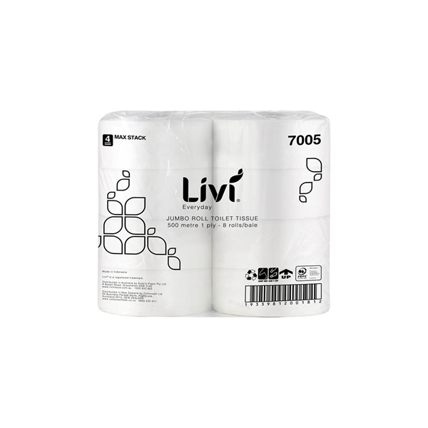 LIVI BASICS JUMBO ROLL TOILET 1-PLY 500M CARTON 8