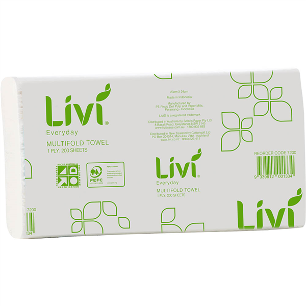 LIVI BASICS MULTIFOLD HAND TOWEL 1-PLY 200 SHEET 230 X 225MM CARTON 20