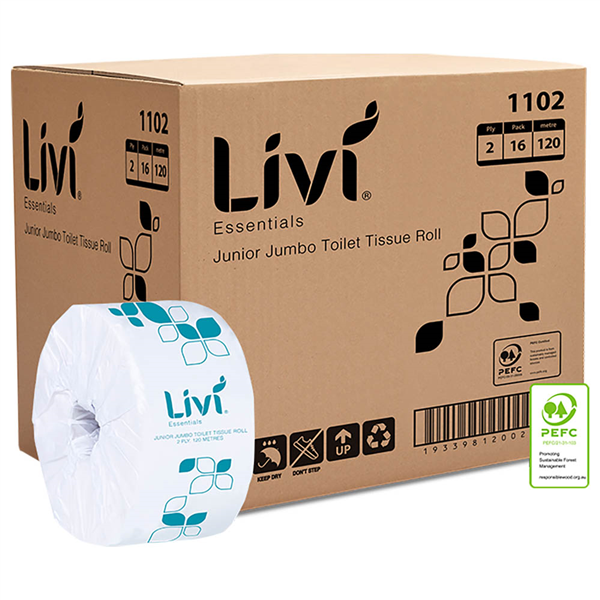 LIVI ESSENTIALS JUNIOR JUMBO TOILET ROLL EMBOSSED 2-PLY 120M CARTON 16