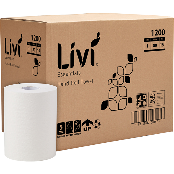 The Livi Essentials 1ply hand roll towel is a disposable towel for hand drying