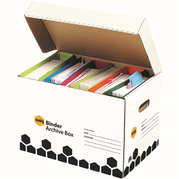 The only archive box designed to hold 6 lever arch files 50% larger for archiving ring binders and lever arch files Triple end walls and double layer base provide superior stacking strength - up to 10 high 'Burst Safe' double layer base ensures contents will not burst through when carried, even with a heavy 20kg load Holds manilla folders, or up to 6 A4 lever arch files, or 12 ring binders The added convenience of a hinged, attached lid Australian made from 100% recycled board and is 100% recyclable Label, track and find all your archived documents using the FREE online Marbig Archive Box Management System www.marbig.com.au/archivesystem