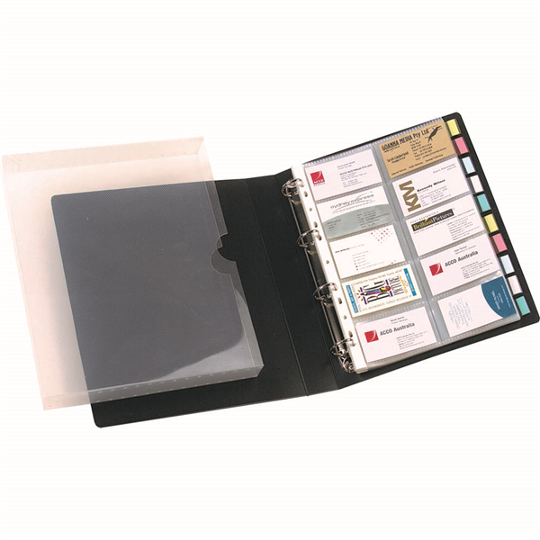 Includes case for storing on desks or shelves to enable file to stand upright and allows for easy transportation Includes pockets, tabs and inserts for personalised indexing of business cards 4D ring binder with capacity for 500 business cards Pockets are reinforced for durability and long life