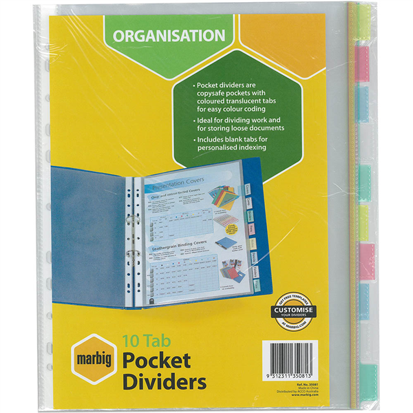 Marbig pocket dividers are copysafe pockets for storing and protecting documents, with coloured clear tabs for easy colour coding, dividing and indexing of documents and other plastic pockets